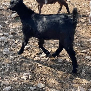 ADGA Registerable Buckling. Black with Minimal White, Blue eyed and Polled(genetically hornless). Dam is our awesome milker Cocoa. Rare chance at a bucking from her!